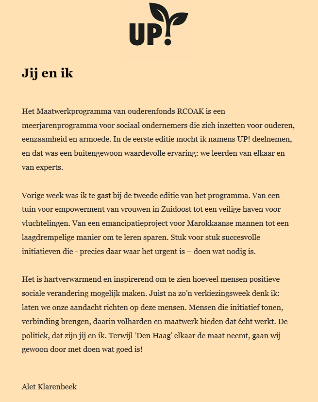 In haar nieuwsbrief vertelt ze hierover. Mooi om te zien hoe alumni van het eerste uur nu hun kennis en expertise weer delen met de nieuwe deelnemers! En mooi hoe ze observeert hoe de initiatieven die vanuit het RCOAK worden ondersteunt, echt het positieve verschil maken in onze samenleving.