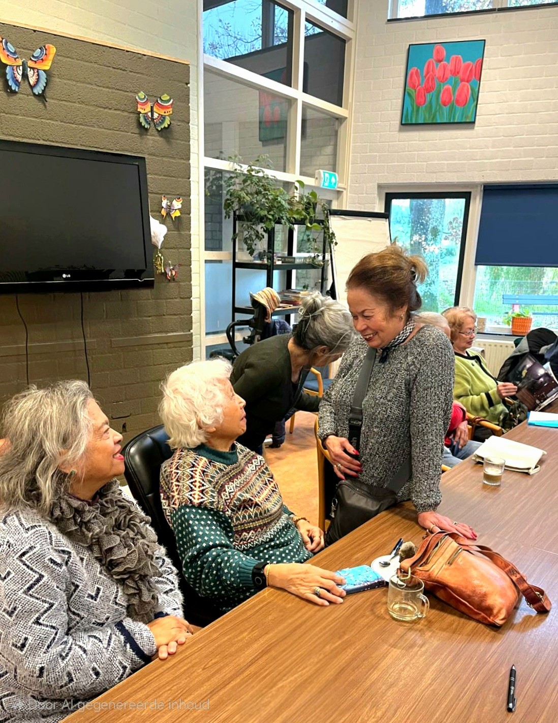 Als ik op deze woensdagochtend in december de ruimte van Kopi Kecil binnenstap, is het al gezellig druk. Uiteindelijk zijn er zo’n 25 deelnemers, allemaal 70+. Ik vind een plekje tussen Monique en Piet en word hartelijk ontvangen. We raken meteen aan de praat. Piet vertelt me dat het een bont gezelschap is: “ik heb een Indische achtergrond, er zijn ook twee deelnemers met Molukse roots én ‘Totoks’ (van Nederlandse afkomst), meestal partner van iemand met Indische roots”. Als ik een cappuccino in de hand gedrukt krijg, laat ik de ruimte op me inwerken. Het ziet er gezellig uit, de zaal is lekker licht. Een lange tafel vult de ruimte en nodigt iedereen uit om aan te schuiven. Er liggen wat spelletjes en in een kast staan wajangpoppen.